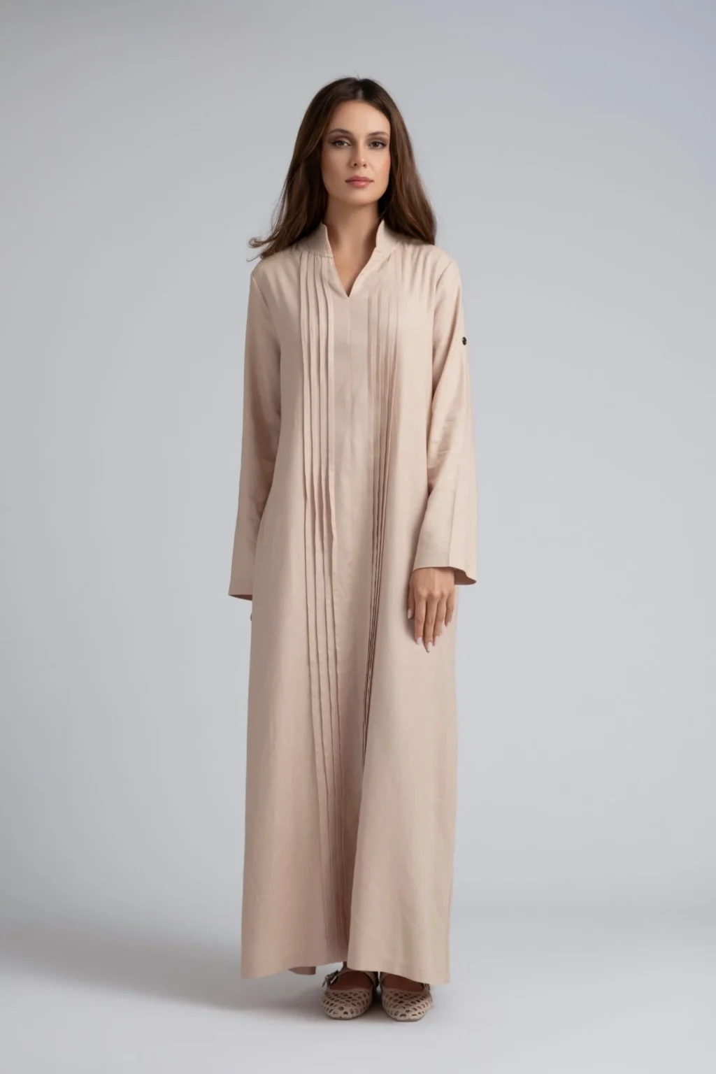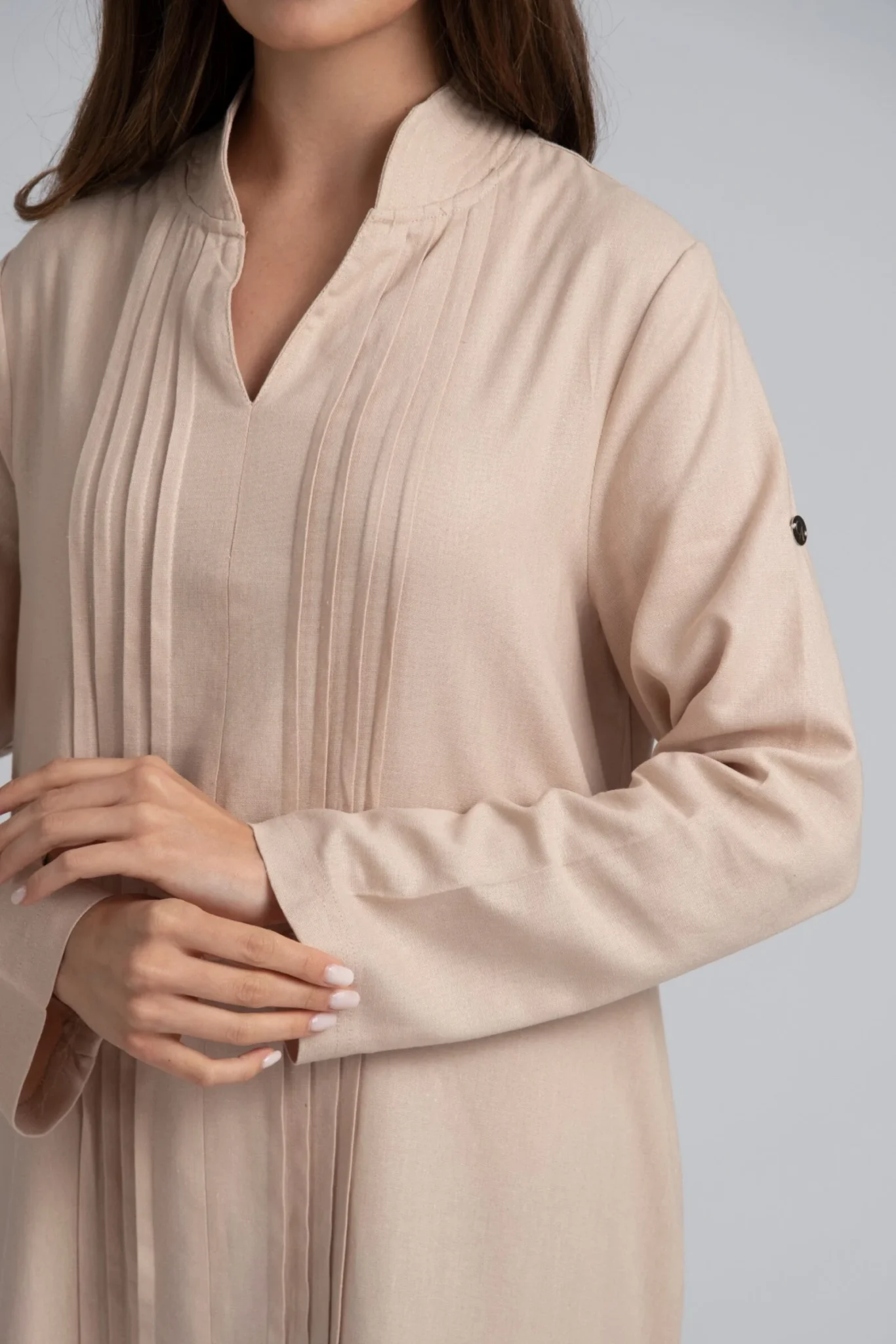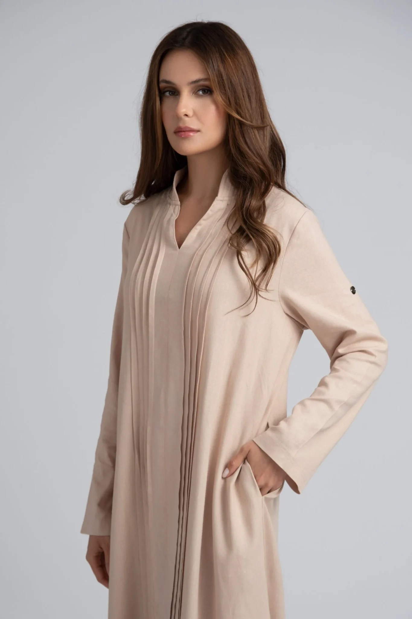 Crafted from a breathable linen blend with a natural drape, this dress combines soft structure with subtle detail. Vertical front pleats bring refined texture to the relaxed silhouette, while the straight cut and slightly dropped shoulders offer everyday ease. A discreet front slit adds movement and shape — barely visible on photos, but clearly shown in motion.