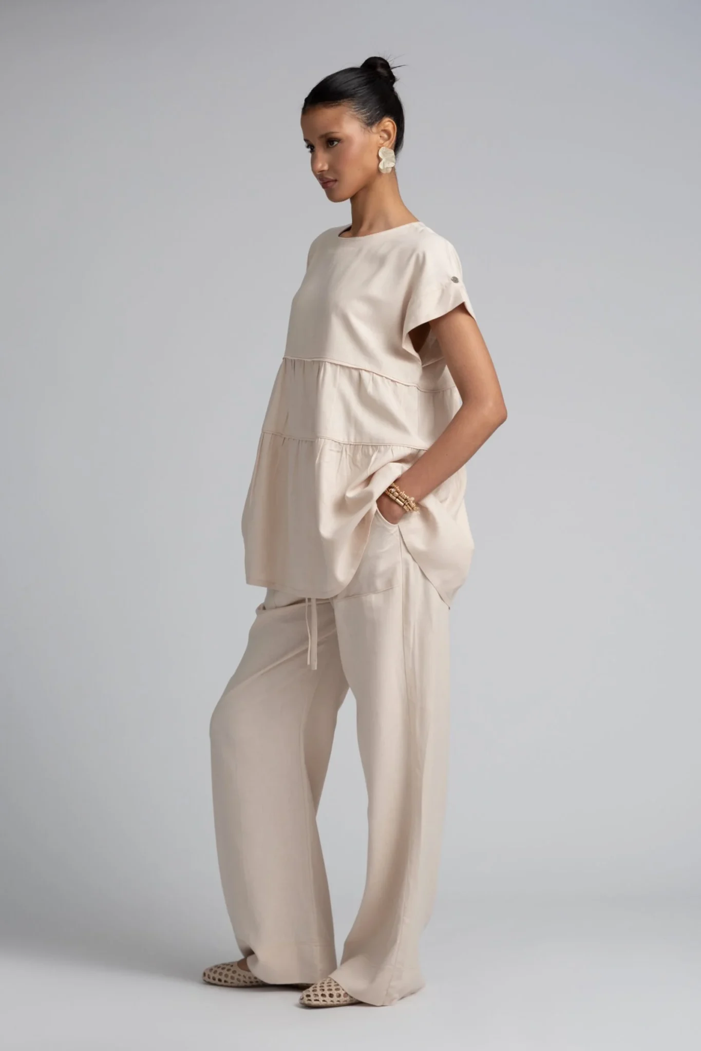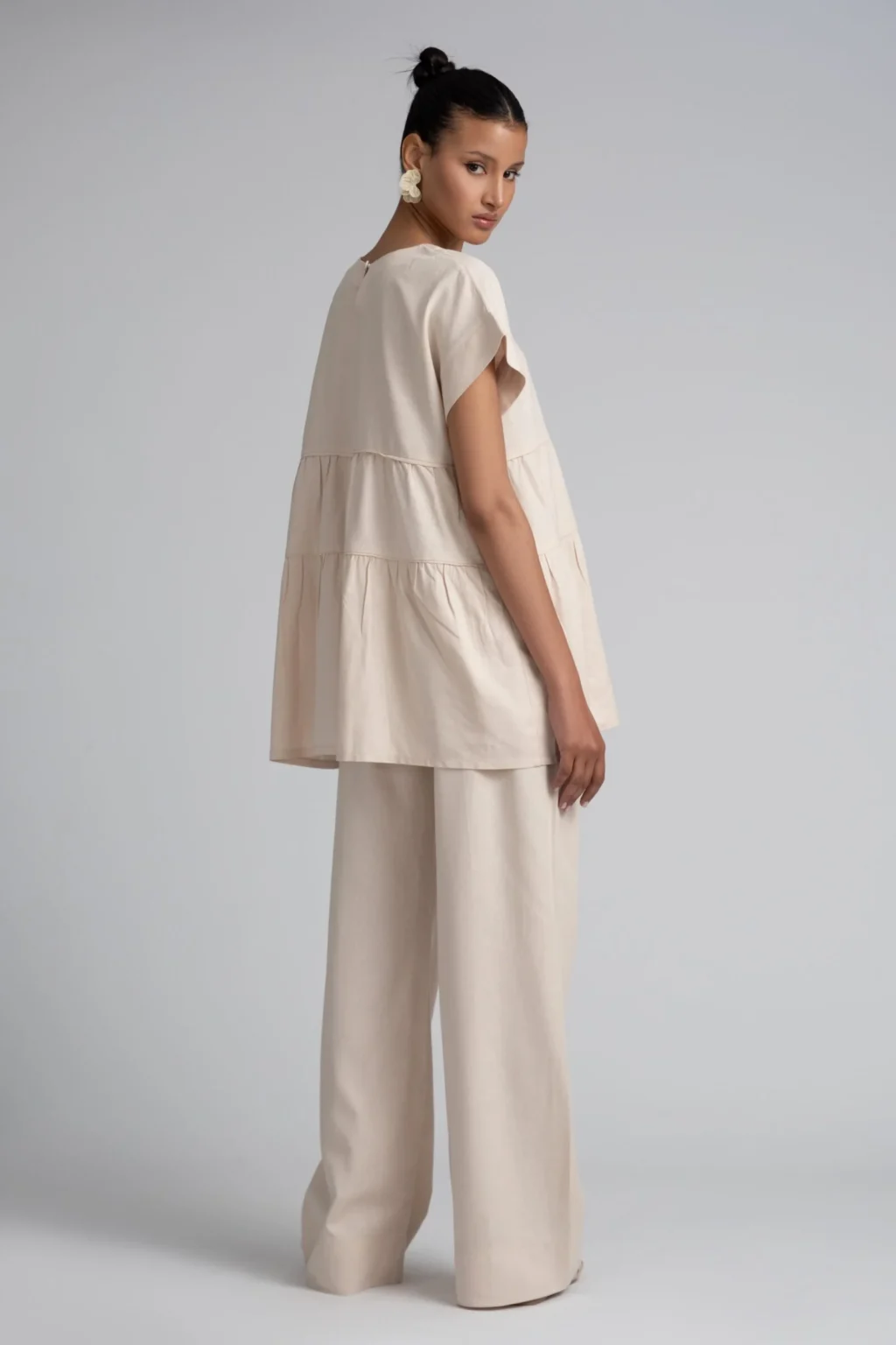 Crafted from a natural linen-cotton blend, chosen for its breathable feel, soft structure, and subtle texture. These wide-leg trousers are cut with a relaxed silhouette and an adjustable drawstring waist, offering comfort without compromising on shape. Side pockets add practicality, while the fluid drape ensures a natural flow with every step. A timeless staple designed for everyday ease, from quiet mornings to warm city days.