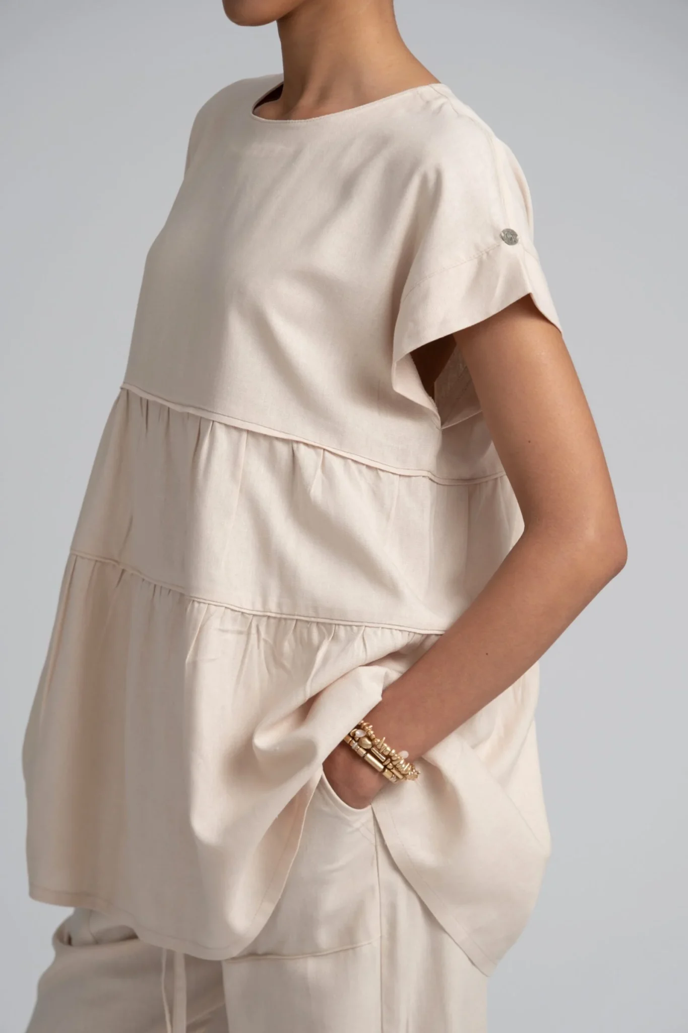 Crafted from a breathable linen-cotton blend, selected for its natural texture, soft structure, and comfortable wear. Designed to retain its relaxed shape with minimal care.
