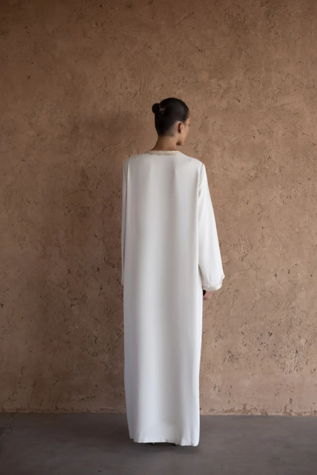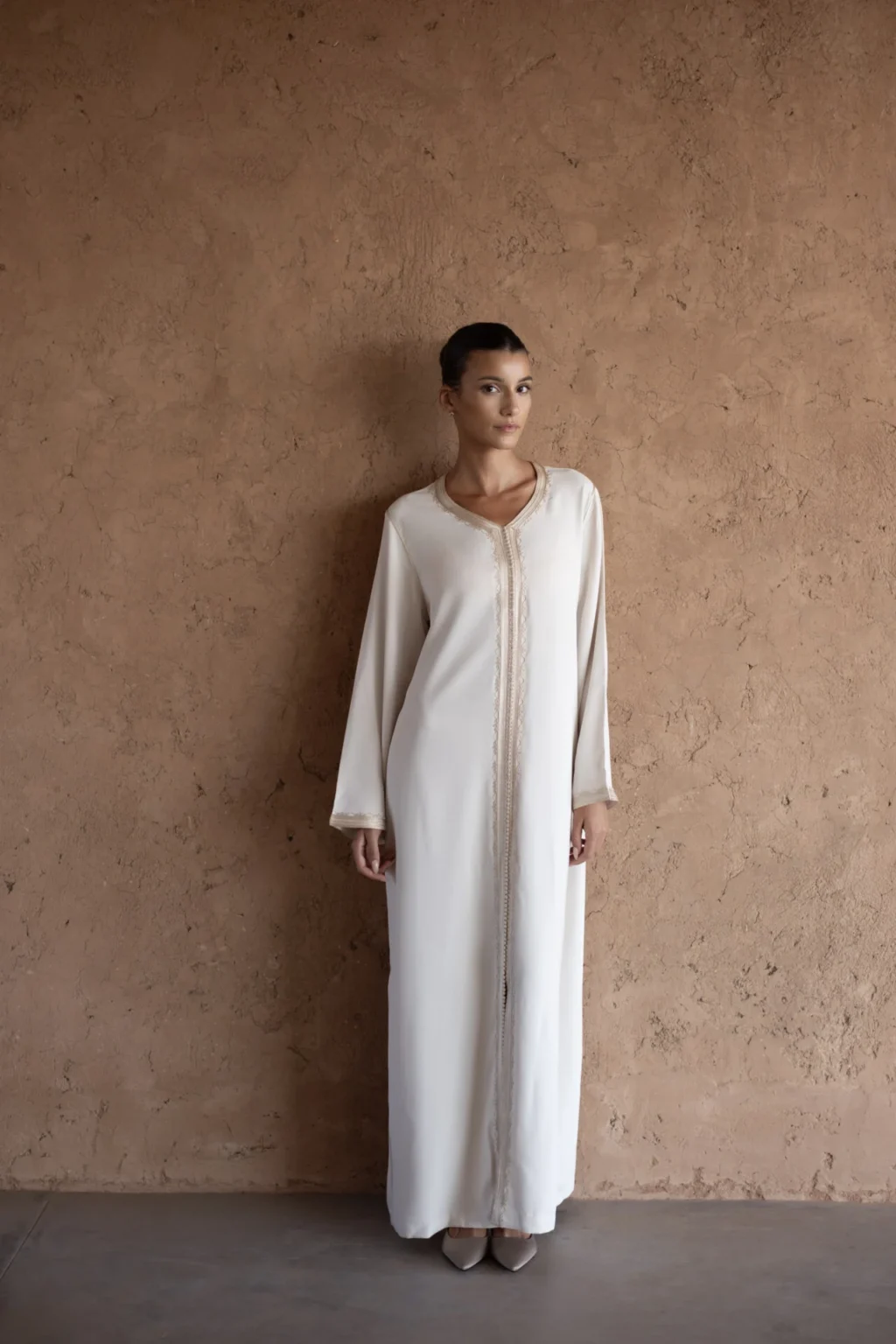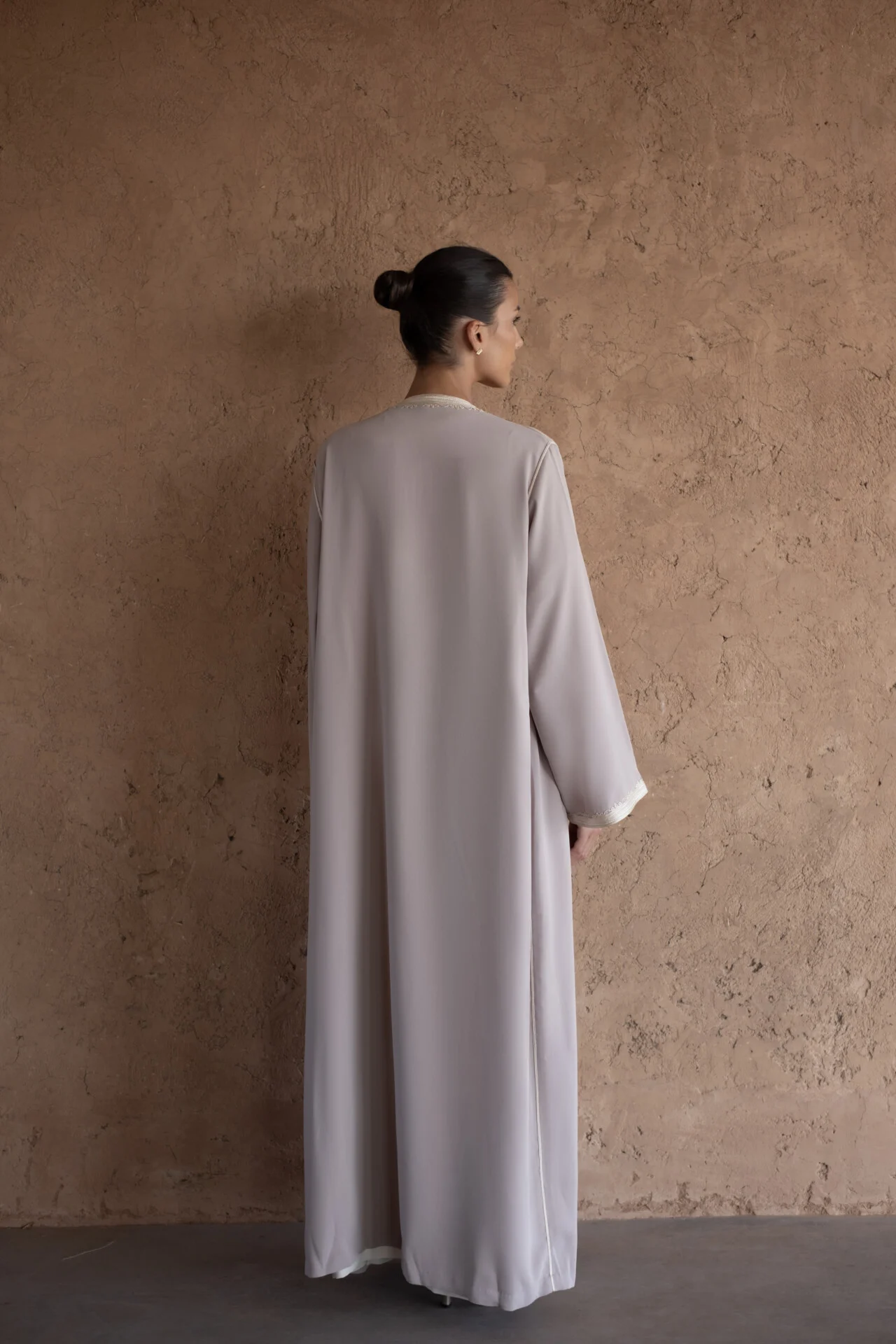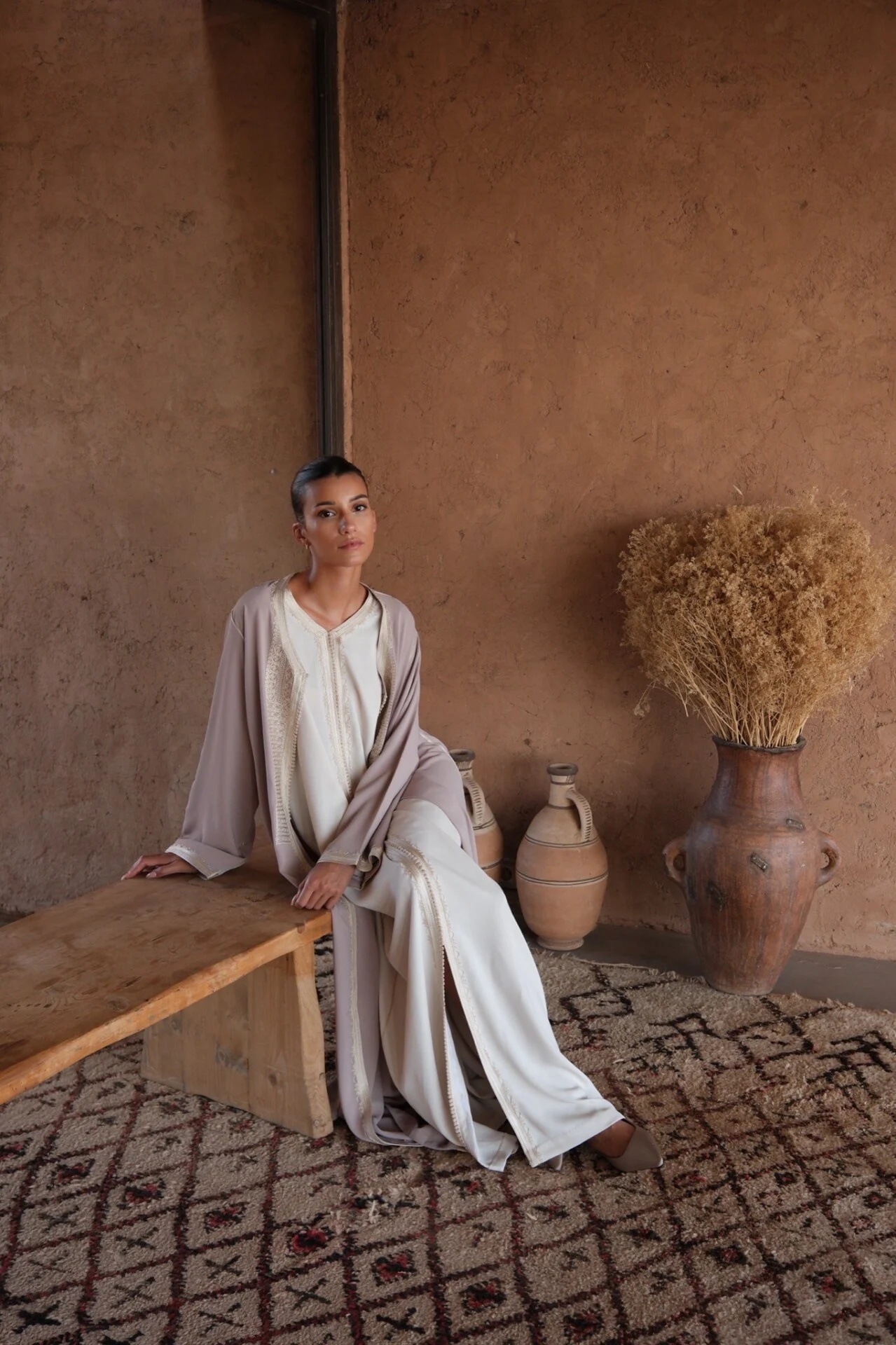 This Moroccan two-piece caftan set in taupe blends modern refinement with traditional craftsmanship. The open caftan is made from premium crêpe and features authentic hand-stitched mâallam embroidery, an elegant nod to Moroccan heritage.